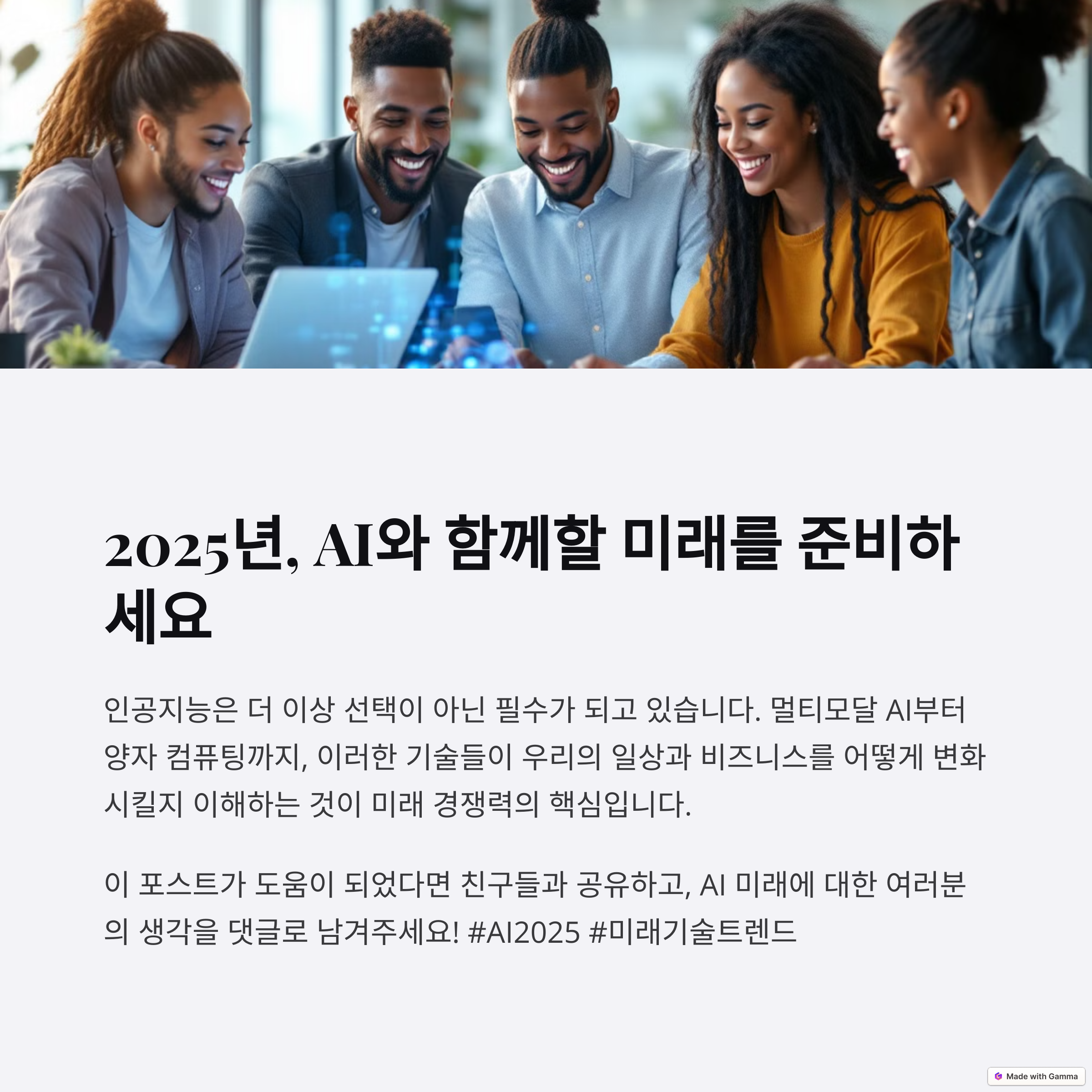AI 시대가 빠르게 변화하면서 새로운 기술을 익히고 활용하는 것이 필수적인 능력이 되었습니다. 에이전트 AI, 멀티모달 AI, AI 거버넌스 플랫폼 등의 핵심 기술들은 기업과 개인 모두에게 중요한 영향을 미칠 것입니다. 앞으로도 AI의 발전을 주목하며, 변화에 발맞춰 적응하는 것이 생존의 핵심 전략이 될 것입니다.