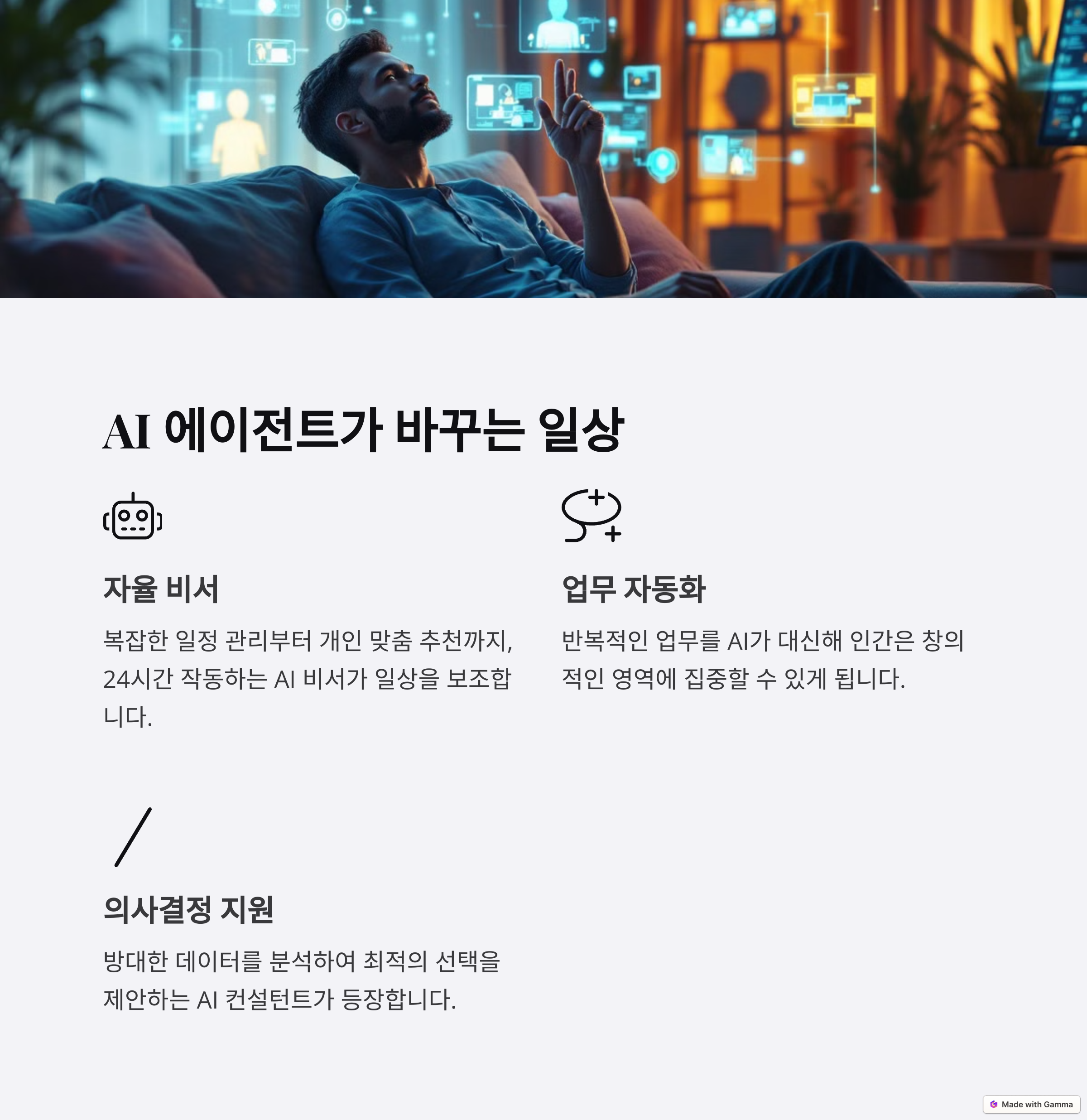 AI 에이전트는 단순한 콘텐츠 생성 기능을 넘어 업무 자동화, 데이터 분석, 고객 지원 등의 역할을 수행할 수 있습니다. 기업들은 AI 에이전트를 활용하여 생산성을 높이고 운영 효율성을 극대화할 수 있을 것입니다.